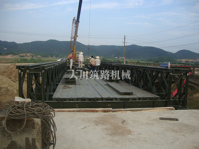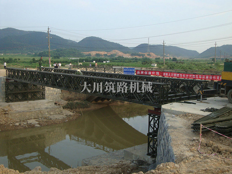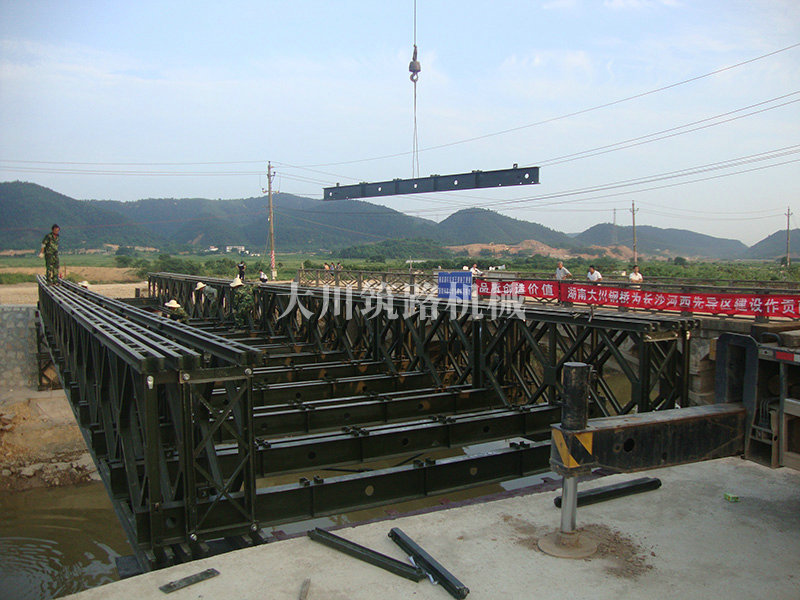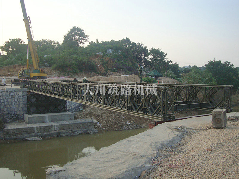特點(diǎn):本鋼橋由國(guó)防科技大學(xué)全程指導(dǎo)和監(jiān)督安裝,滿足荷載80T施工車(chē)輛通行,因施工場(chǎng)地要求,采用貝雷梁組合式橋墩,安裝拆除方便,穩(wěn)定性好。采用推出法安裝,安裝周期20天,于2011年5月25日通車(chē)。